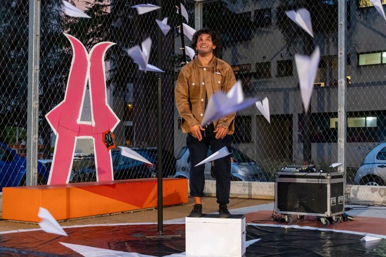 Poi è stata la volta di Lorenzo Aureli, alias Talbò, con Bagatella. Qui il discorso circense è cambiato: dal dramma interiore alla leggerezza del gioco. Il palo cinese diventa albero, scala, trampolino; compagno silenzioso di un artista che ha invitato tutti a guardare il cielo. Con un gesto semplice e geniale, Talbò ha consegnato al pubblico i suoi “solcanuvole”: piccoli aerei di carta, pronti a solcare l’aria della piazza, perché come dichiara più volte l’artista durante lo spettacolo, il gioco è bello se condiviso. In pochi istanti il campo da basket si è trasformato in un mare di risate e voli improvvisati, in una coreografia collettiva dove adulti e bambini hanno ritrovato la gioia di lanciare in alto un sogno. Quel gesto infantile e universale – piegare un foglio, lasciarlo andare – si è fatto rito comunitario: un invito a ritrovarsi insieme, a giocare senza schermi né barriere, a liberarsi dal peso della solitudine.