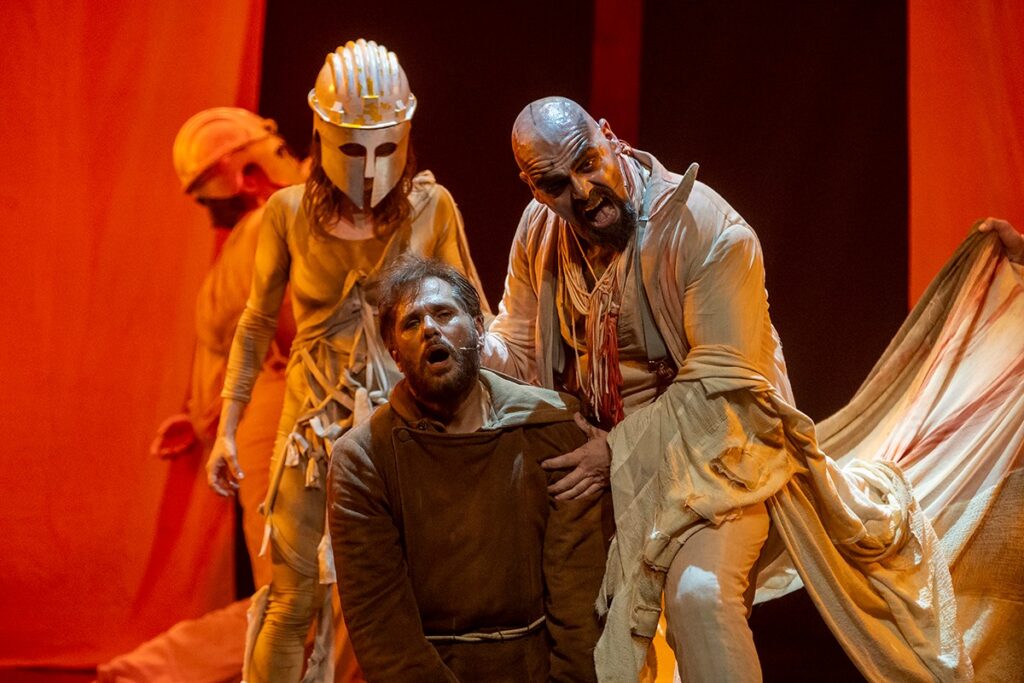 Tra le prove interpretative spicca quella di Maurizio Semeraro, che costruisce un antagonista/demone di forte impatto scenico. La sua presenza è calibrata con attenzione, giocata su gestualità controllata, postura studiata e una vocalità che contribuisce a definire un personaggio inquietante ma mai caricaturale, ben inserito nell’equilibrio complessivo dello spettacolo.