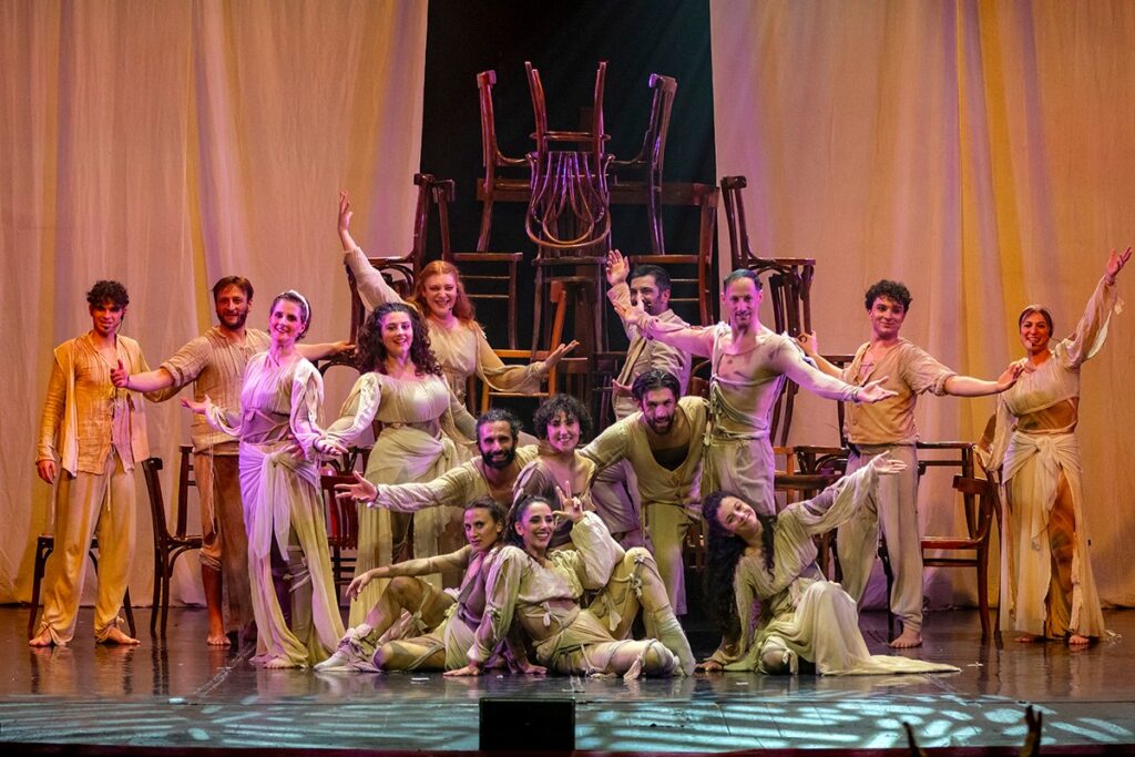 Dal punto di vista vocale, la compagnia – numerosa e ben amalgamata – affronta un repertorio eterogeneo che attraversa registri diversi: dal canto gregoriano fino a sonorità popolari e richiami alla taranta, passando per aperture più moderne. In alcuni momenti, soprattutto grazie alla presenza dei performer più giovani, il pubblico viene coinvolto direttamente, anche attraverso movimenti nello spazio della platea che trasformano la sala in parte attiva della scena.