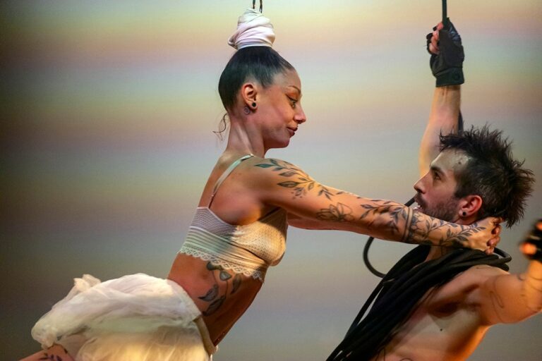 DansCirque – Tre movimenti sull’identità ha incantato il pubblico della Rassegna Battiti al Teatro Furio Camillo lo scorso 14 novembre, confermando ancora una volta l’altissima qualità della proposta culturale portata in scena da Caterina Mochi Sismondi e dalla sua Compagnia, blucinQue. La serata è stata un viaggio intenso e sorprendente tra circo contemporaneo, teatro, danza, musica dal vivo; ogni gesto, ogni sospensione, ogni nota musicale eseguita sul palco ha trovato una perfetta sintonia con la poetica visionaria che caratterizza la produzione artistica della Mochi Sismondi.