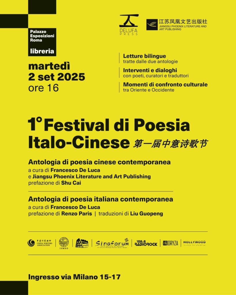 Delufa Press e Jiangsu Phoenix Literature and Art Publishing, in collaborazione con ASIC – Associazione Sviluppo Italia CinaISMEO – Associazione Internazionale di Studi sul Mediterraneo e l’Oriente, Hollywood Tutto sul CinemaRadio Rock e Sinaforum, sono lieti di presentare il 1° Festival di poesia italo-cinese, una giornata dedicata al dialogo culturale tra Italia e Cina attraverso la poesia contemporanea.