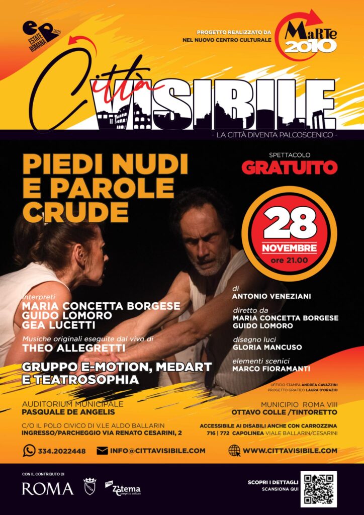 Maria Concetta Borgese e Guido Lomoro, dopo il grande successo della scorsa stagione, tornano venerdì 28 novembre all’Auditorium Municipale Pasquale De Angelis (Via Renato Cesarini, 2 – VIII Municipio) con Piedi nudi e parole crude, uno spettacolo che intreccia poesia, danza e musica in un’unica, intensa narrazione emotiva.