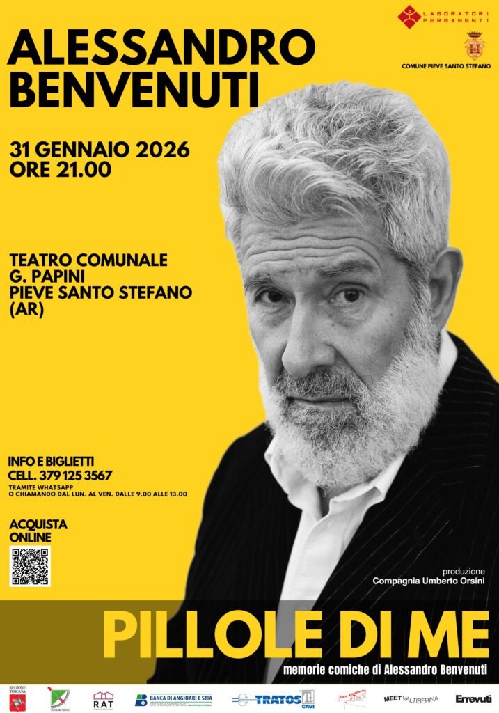 (Lo spettacolo è fuori abbonamento con un biglietto unico al costo di 20€ è acquistabile online al seguente link https://oooh.events/evento/alessandro-benvenuti-in-pillole-di-me-biglietti/ o presso la nostra sede a Campaccio di Sansepolcro (Ar) aperta dal lun. al ven. dalle ore 9.00 salle 13.00)