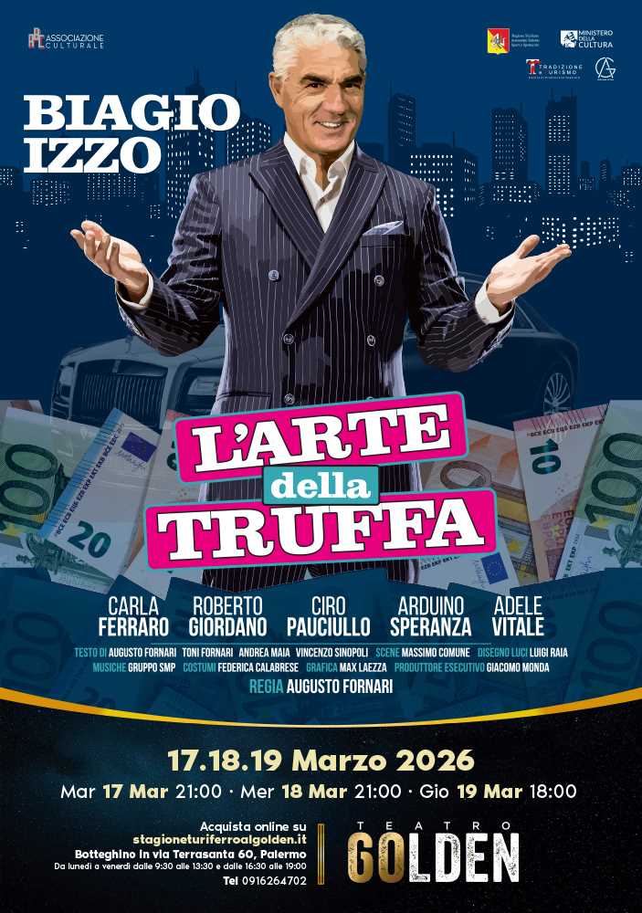 La comicità travolgente e inconfondibile di BIAGIO IZZO approda in Sicilia con L’ARTE DELLA TRUFFA di Toni Fornari, Andrea Maia, Vincenzo Sinopoli e Augusto Fornari che firma anche la regia. Prodotta da AG Spettacoli, si alza il sipario su una commedia piena di equivoci, colpi di scena e situazioni esilaranti, in un crescendo di puro divertimento. Dal 17 al 19 marzo 2026, la messinscena verrà ospitata dal Teatro Golden di Palermo, nell’ambito della nella nuova stagione Turi Ferro. Biglietti disponibili al link https://www.vivaticket.com/it/ticket/biagio-izzo-l-arte-della-truffa/283663.