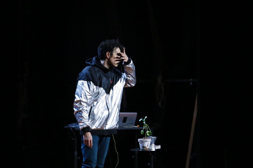 In una scenografia minimale dominata da un microfono e una consolle, spiccano tre oggetti simbolici: una moka, un volume del “Candido” di Voltaire e una piantina “mezza morta” che rappresenta l’ultima tenace speranza di tornare a “coltivare il proprio giardino” nonostante le difficoltà del presente. È un racconto cinico e violento, ma anche indulgente, che trasforma una riflessione sull’abbandono in una sorta di commedia romantica distorta.