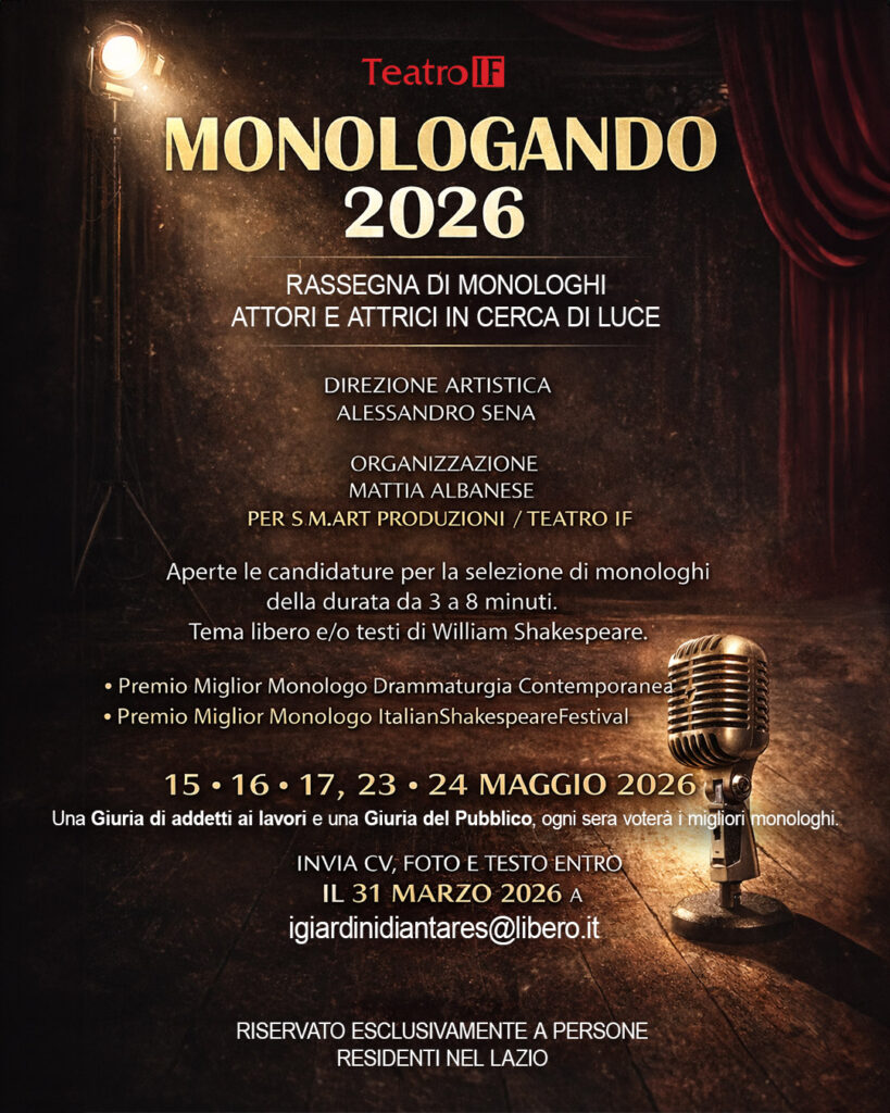 Al via le candidature per MONOLOGANDO 2026 – Rassegna di monologhi al Teatro IF di Roma