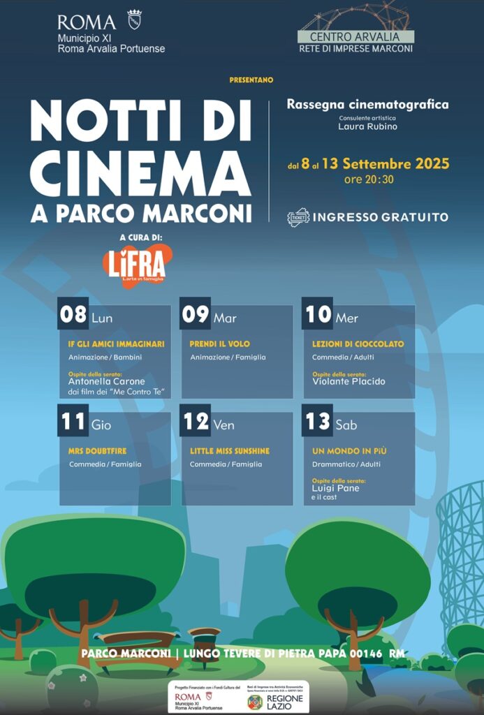Torna a Roma, la II edizione della rassegna cinematografica “Notti di Cinema a Parco Marconi”, che si terrà nella splendida cornice del Parco Marconi, dall’8 al 13 settembre 2025, rassegna promossa e finanziata dal Municipio XI Arvalia del Comune di Roma e dalla Rete Centro Arvalia – Rete di Imprese Marconi.