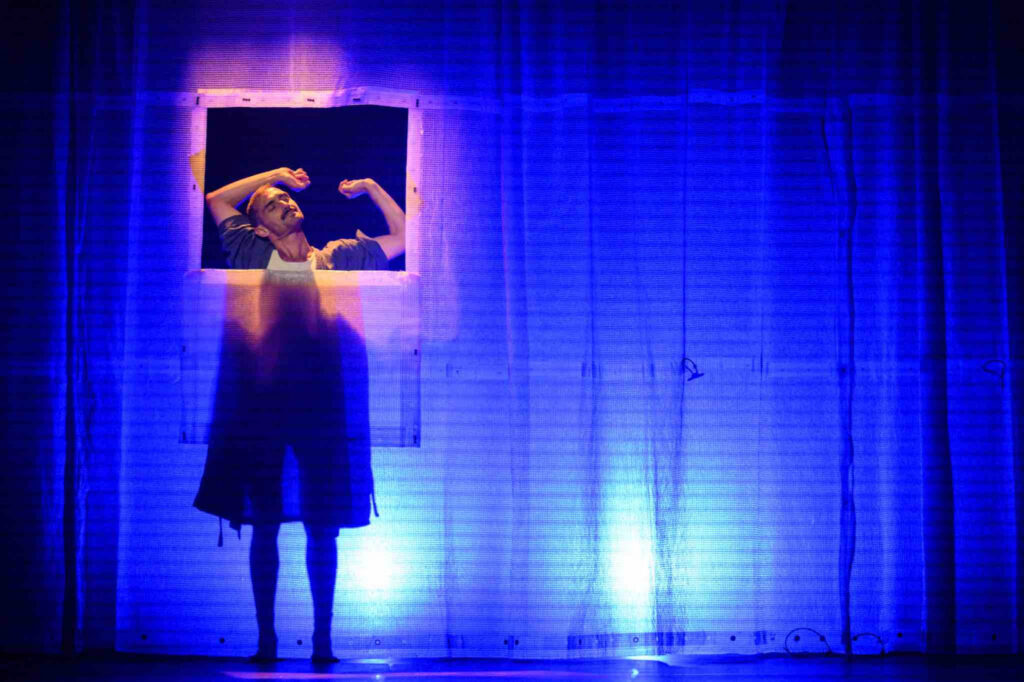 Nuovamente ospite della programmazione di Orbita Spellbound, il poliedrico artista presenta Apocalipsync, una pièce nata nella primavera del 2020 durante il primo lockdown, in cui ogni scena rappresenta una tappa della trasformazione di un uomo, immerso in un mondo che limita la sua libertà, conducendolo dentro ad una crisi esistenziale al termine della quale ritroverà sé stesso.