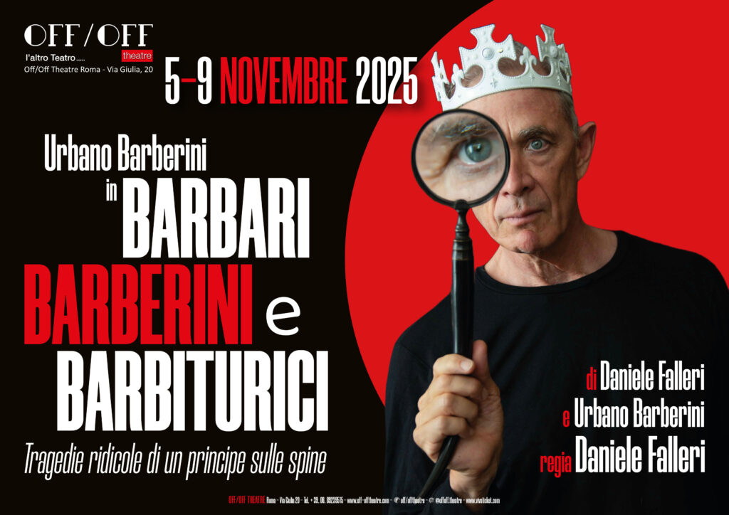 L’OFF/OFF Theatre apre col sorriso la sua ottava stagione. Da mercoledì 5 a domenica 9 novembre lo spettacolo d’apertura scelto dal direttore artistico Silvano Spada, è “Barbari, Barberini e Barbiturici – Tragedie ridicole di un Principe sulle spine”. Un gradito e richiesto ritorno quello di Urbano Barberini, protagonista in scena di un irriverente bio-show scritto insieme a Daniele Falleri. E che quello che non hanno distrutto i barbari lo hanno distrutto i Barberini, si percepisce perfettamente tra le righe ironiche e altrettanto vere che l’attore interpreta, senza dar scampo al pubblico che, divertito, osserva il principe lavare sul palco i panni di una vita, tra battute al vetriolo e ritratti aristocratici che strappano applausi.