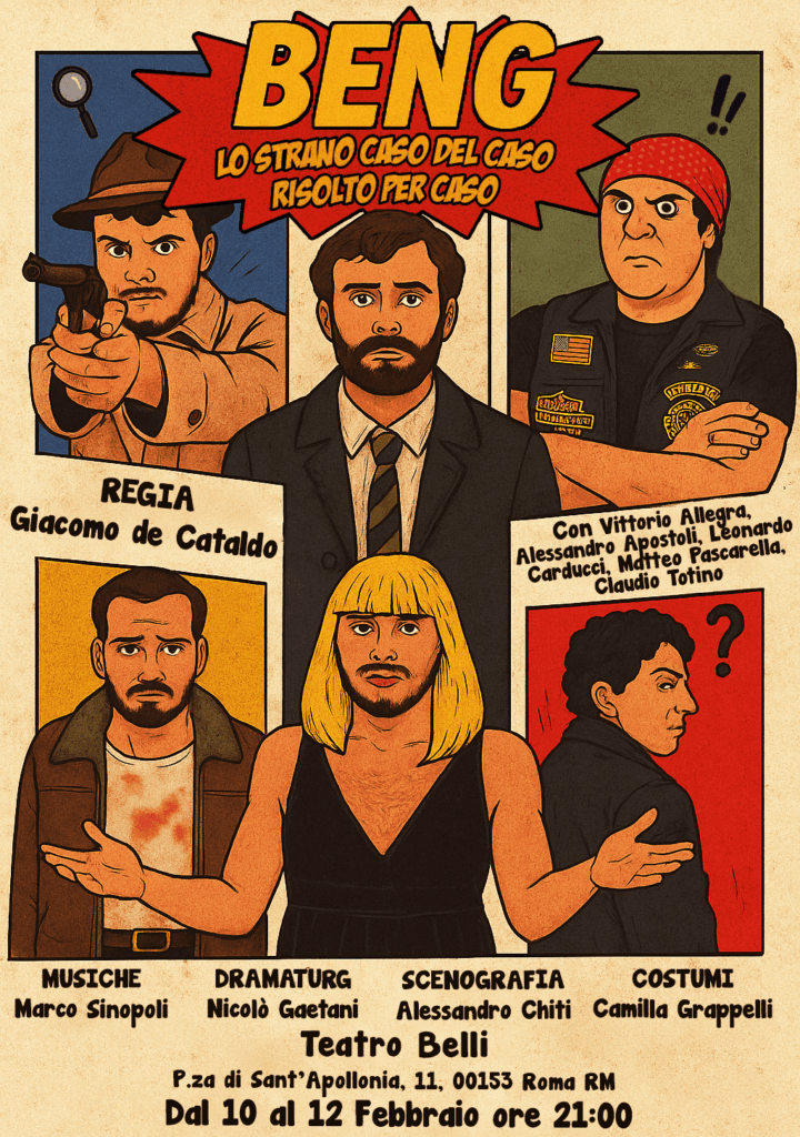 occasione della Rassegna di drammaturgia italiana contemporanea EXPO- Teatro Italiano Contemporaneo, torna in scena dal 10 al 12 febbraio, questa volta al Teatro Belli di Roma, lo spettacolo BENG! – Lo strano caso del caso risolto per caso, scritto da Leonardo Carducci, Alessandro Apostoli, Vittorio Allegra, Claudio Totino, Matteo Pascarella, Nicolò Gaetani eGiacomo De Cataldo, che firma anche la regia.