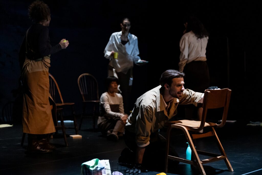 Chair/IL POSTO del regista giapponese Takahiro Fujita è un’opera teatrale che esplora i temi dell’identità, della memoria condivisa e della ricerca di connessione in un mondo apparentemente immobile. Attraverso una struttura narrativa fatta di episodi reali, interviste, ricordi e flussi di coscienza, cinque giovani artisti – provenienti da diversi contesti culturali – convivono su un palcoscenico che diventa casa, spazio pubblico e luogo mentale. Le immagini proiettate sul fondale, tratte dalle strade di Sansepolcro, fungono da scenografia ma anche da simbolo di un mondo esterno che resta inerte, immobile, mentre i protagonisti si muovono, agiscono, sognano. Il titolo allude alla “sedia” come spazio personale e a “il posto” come spazio condiviso, un luogo dove si può stare insieme. Le sedie ai margini del palco rappresentano uno spazio intimo per chi non recita e diventano anche dispositivi narrativi in cui si intrecciano ricordi d’infanzia, rapporti familiari e desideri. La scenografia, con mobili sospesi che riflettono la luce sul pubblico, suggerisce uno scambio silenzioso tra scena e platea: una forma di comunicazione tra i giovani artisti e gli spettatori, un invito alla riflessione.