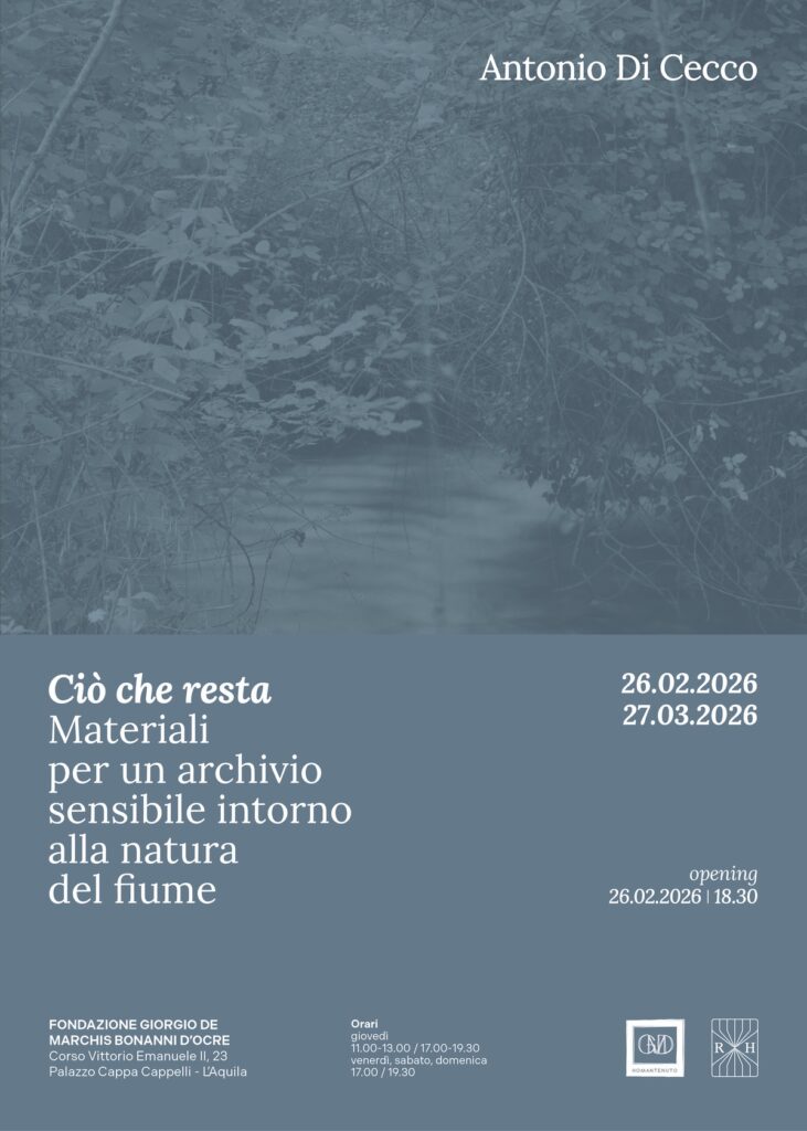 Giovedì 26 febbraio 2026 alle ore 18.30, la Fondazione Giorgio de Marchis Bonanni d’Ocre è lieta di ospitare la mostra Ciò che resta – Materiali per un archivio sensibile intorno alla natura del fiume di Antonio Di Cecco, a cura della Fondazione e di RVM Hub.