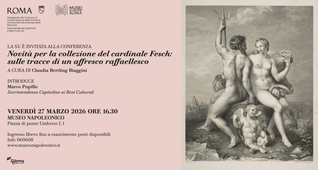 Il primo appuntamento, dal titolo Novità per la collezione del cardinale Fesch. Sulle tracce di un affresco raffaellesco (venerdì 27 marzo alle 16.30), è dedicato alle recenti scoperte sulla raccolta del cardinale Joseph Fesch (1763-1839), tra le più rilevanti collezioni d’arte nella Roma di primo Ottocento. La conferenza, tenuta daClaudia Bertling Biaggini, approfondirà la figura del porporato, zio di Napoleone Bonaparte da parte materna, e il suo ruolo nel quadro dei complessi rapporti che legavano il papato e l’impero napoleonico, concentrandosi in particolare su un dipinto murale raffigurante una coppia di divinità con Nettuno. La studiosa illustrerà l’ipotesi, argomentata nel suo recente libro Raffaels Metamorphosen in der Stufetta Bibbiena (Schnell & Steiner, Regensburg 2025), secondo cui l’affresco proverrebbe dalla cosiddetta “Stufetta Bibbiena” nel Palazzo Apostolico Vaticano, ambiente affrescato da Raffaello e dai suoi collaboratori nel 1516 e noto come la “sala da bagno più bella del Rinascimento”.