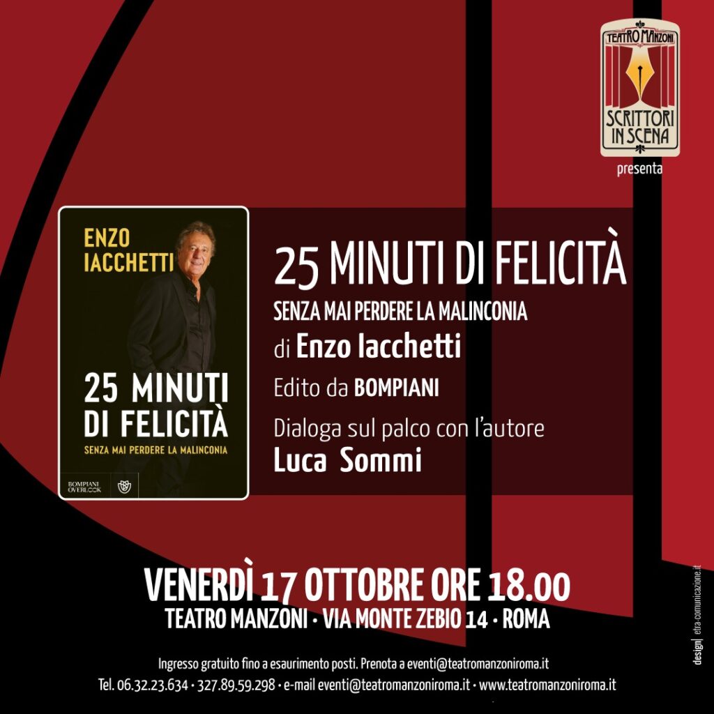 Dalle canzoni del molleggiato ai comici del Derby, dal Maurizio Costanzo Show a Striscia la notizia, dai ricordi in bianco e nero alla rivoluzione dei social. Con il suo libro 25 MINUTI DI FELICITÀ Senza mai perdere la malinconia, edito da Bompiani, Enzo Iacchetti è protagonista al Teatro Manzoni di Roma del nuovo appuntamento di SCRITTORI IN SCENA, venerdì 17 ottobre alle ore 18.00. Un viaggio nel tempo attraverso tutti i minuti felici, quelli che – se sappiamo riconoscerli e proteggerli – nessuno potrà toglierci. Dialoga sul palco con l’autore Luca Sommi.