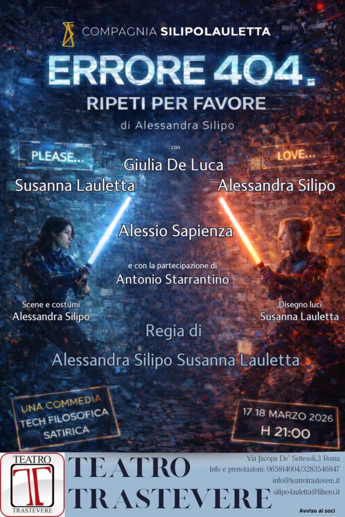 Errore 404. Ripeti per favore – Di: Alessandra Silipo – Regia di: Alessandra Silipo, Susanna Lauletta – Con: Giulia De Luca, Susanna Lauletta, Alessio Sapienza, Alessandra Silipo e con la partecipazione di Antonio Starrantino.