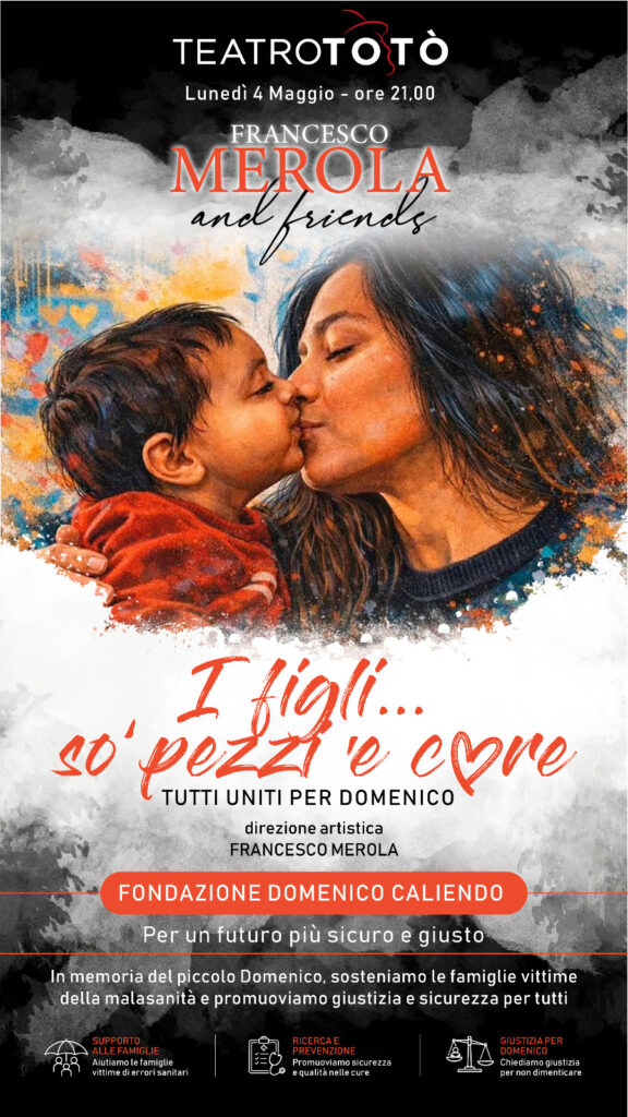Lunedì 4 maggio, alle ore 21:00, il Teatro Totò di Napoli (via Frediano Cavara 12/e) ospiterà “I figli… so’ pezzi ’e core – Tutti uniti per Domenico”, una serata-evento di musica e solidarietà a favore della Fondazione Domenico Caliendo, alla quale sarà devoluto l’intero incasso. Promotore dell’iniziativa, e alla direzione artistica dell’evento, c’è Francesco Merola, cantante e attore napoletano, figlio del leggendario Mario Merola, da anni impegnato nel portare avanti la grande tradizione musicale partenopea.