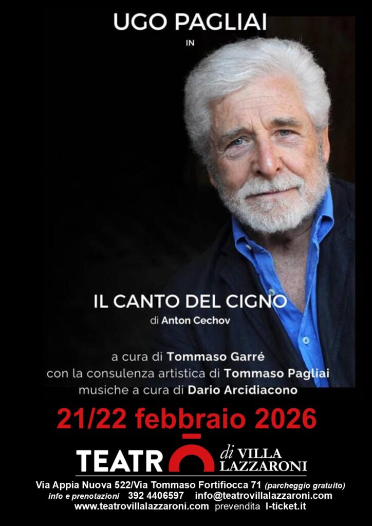 Sabato 21 e domenica 22 febbraio il Teatro di Villa Lazzaroni presenta Il Canto del cigno di Anton Cechov, con Ugo Pagliai, spettacolo a cura di Tommaso Garré, con la consulenza artistica di Tommaso Pagliai e le musiche a cura di Dario Arcidiacono.