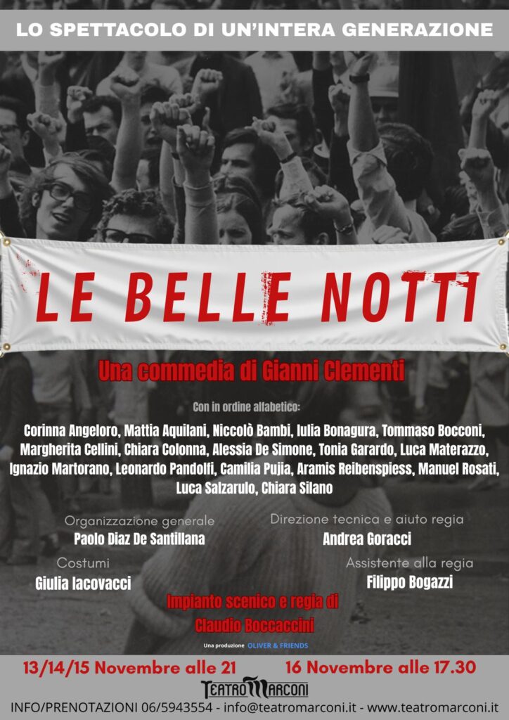 Le Belle notti è una commedia di Gianni Clementi, diretta da Claudio Boccaccini, tenera e divertente, ma anche malinconica e crudele, che scandaglia senza giudicare un’età della vita, quella prossima ai vent’anni, sbirciandola in due epoche diverse e per certi versi lontanissime: quella della ribellione e dell’anticonformismo della fine degli anni ’60 e quella dell’omologazione, quindi apparentemente immobile e pacificata, dei giorni nostri.