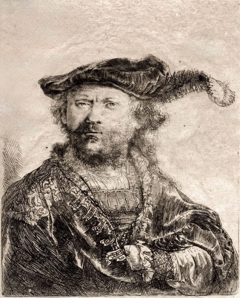 Il percorso espositivo nasce da un episodio fondativo della biografia di Guarneri: l’incontro giovanile, negli Anni ’50, con le opere di Rembrandt durante un viaggio nei Paesi Bassi, esperienza che ne ha orientato in modo decisivo l’indagine sulla luce, sulla rarefazione del colore e sulla costruzione percettiva della superficie pittorica. Le venti incisioni del maestro olandese, provenienti da una collezione privata del territorio urbinate, offrono un quadro eloquente dell’evoluzione dell’incisore nell’uso del chiaroscuro e costituiscono un riferimento imprescindibile nel contesto europeo. Tra i fogli esposti figurano alcuni dei titoli più celebri della grafica rembrandtiana, come Inno di Simeone (Presentazione al tempio) (ca. 1640), La négresse couchée (1658), Autoritratto con Saskia (1636), Autoritratto con cappello di piume (1638), L’angelo appare ai pastori (1634), Donna che bagna i piedi in un ruscello (1646), Erudito nello studio (1652).