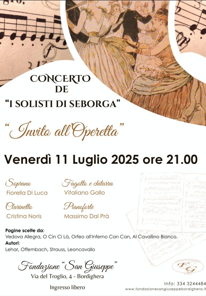 E’ proprio in questa Fondazione che Venerdì 11 Luglio alle 21h avrà luogo un concerto dedicato all ‘Operetta dei solisti di Seborga diretti da Vitaliano Gallo al fagotto, Fiorella Di Luca soprano, Cristina Noris clarinetto, Massimo Dal Prà pianoforte.
