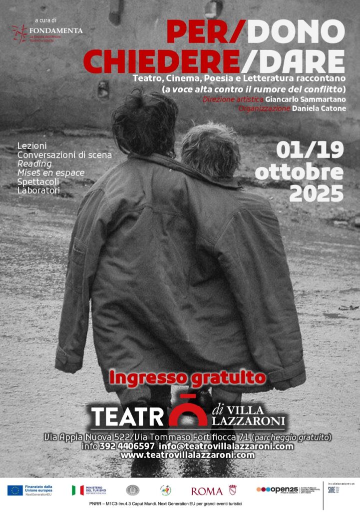 Nell’ambito dell’Avviso Pubblico “Artes et Iubilaeum 2025” promosso da Roma Capitale in occasione del Giubileo 2025, Fondamenta Teatro e Teatri presenta PER/DONO, CHIEDERE/DARE Teatro, cinema, poesia e letteratura raccontano (a voce alta contro il rumore del conflitto). Dall’1 al 19 ottobre 2025, presso il Teatro di Villa Lazzaroni, presidio culturale e Teatro di Comunità del Municipio Roma VII, si svilupperà un ciclo di Laboratori, Lezioni/Spettacolo, Conversazioni di scena, Reading, Mise en espace e Spettacoli che intrecciano il loro racconto sul tema del dono, del perdono, della fratellanza, mai così necessari come oggi. Storia e storie del conflitto e della riconciliazione che il Cinema, il Teatro, la Poesia, la Letteratura hanno saputo nel tempo interpretare. La narrazione trarrà spunto da tante opere italiane ed europee, diverse eppure convergenti, nel confronto tra popoli, ideologie, culture, religioni. Un’occasione per pensare, riflettere, imparare, senza rinunciare al piacere più grande: la rappresentazione d’arte, di Storie, di uomini. Per una riflessione sentimentale contro la peste del mondo: il conflitto, la violenza, la sopraffazione, guardando senza veli al dolore degli ultimi.