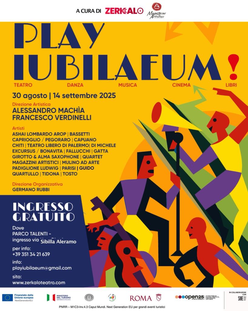 COMPAGNIA ZERKALO, in associazione con MAGAZZINI ARTISTICI APS, presenta PLAY IUBILAEUM!, la prima edizione di un festival multidisciplinare dedicato alle arti performative che si svolgerà dal 30 agosto al 14 settembre 2025 presso il Parco Talenti di Roma, con la direzione artistica di Alessandro Machìa e Francesco Verdinelli