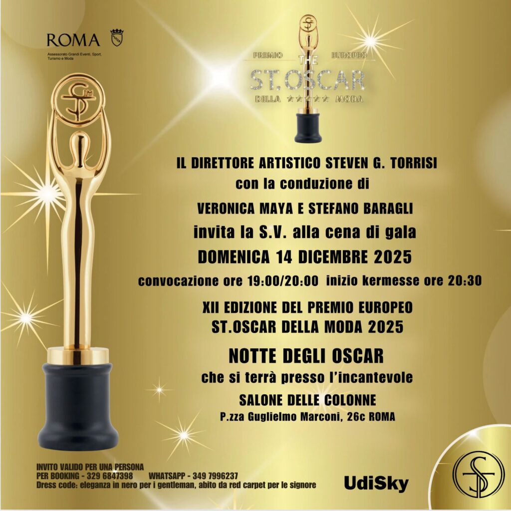 Si terrà al Salone delle Colonne dell’Eur, a Roma, domenica 14 dicembre alle ore 20.30 la XII Edizione del prestigioso Premio Europeo ST. Oscar della Moda, ideato dal direttore artistico Steven G. Torrisi, con il patrocinio dell’Assessorato Grandi Eventi, Sport Turismo e Moda di Roma Capitale.