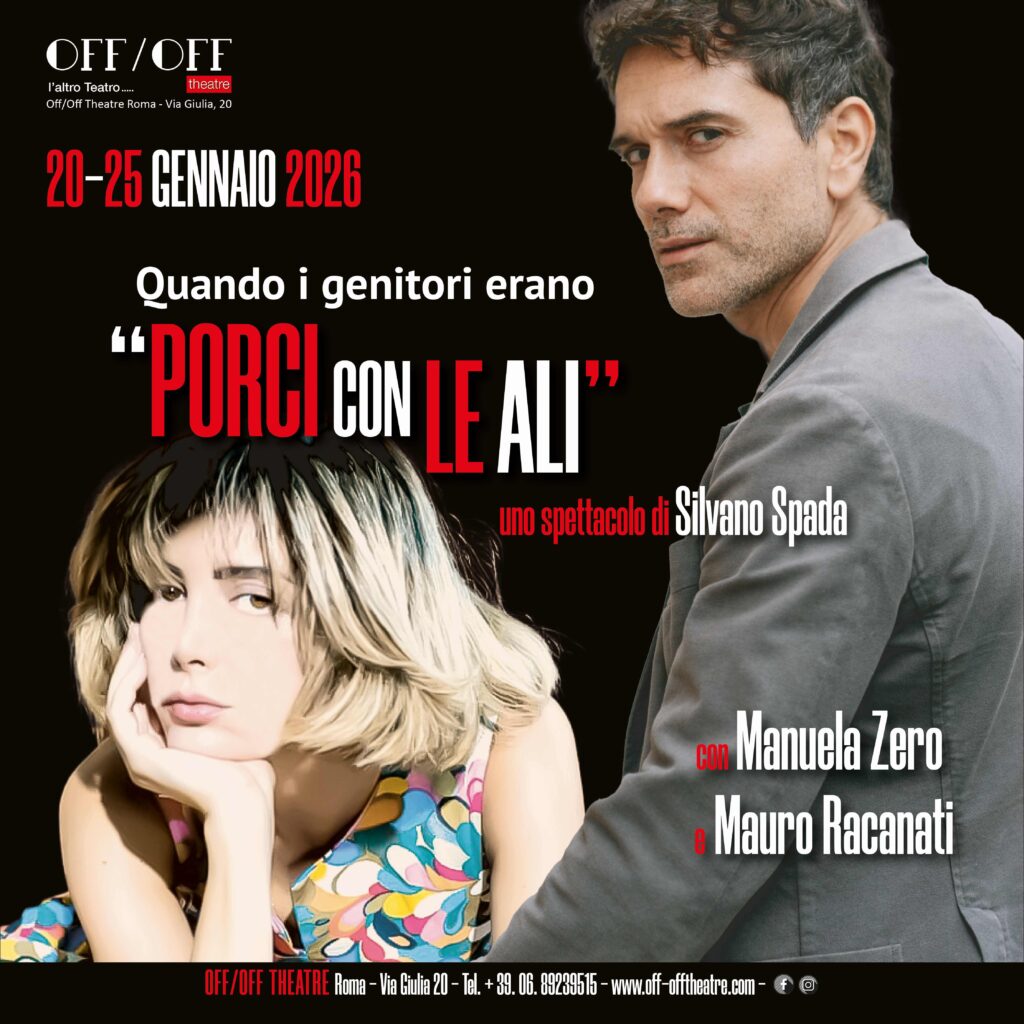 Sono passati cinquant’anni dall’uscita dello scandaloso “Porci con le ali”, di Lidia Ravera e Marco Lombardo Radice. Per questo il Nuovo Anno all’OFF/OFF Theatre, inizia con la celebrazione scenica di un anniversario letterario importante, dedicato a uno “tra i grandi romanzi del Novecento”. Da questo, è tratto l’atteso debutto nazionale del nuovo testo di Silvano Spada, dal titolo “Quando i genitori erano porci con le ali”, che resterà in scena da martedì 20 a domenica 25 gennaio. Uno spettacolo interpretato da Manuela Zero e Mauro Racanati, protagonisti sullo spazio curato da Umberto Fiore, con l’assistenza alla regia Spada di Orazio Rotolo Schifone.