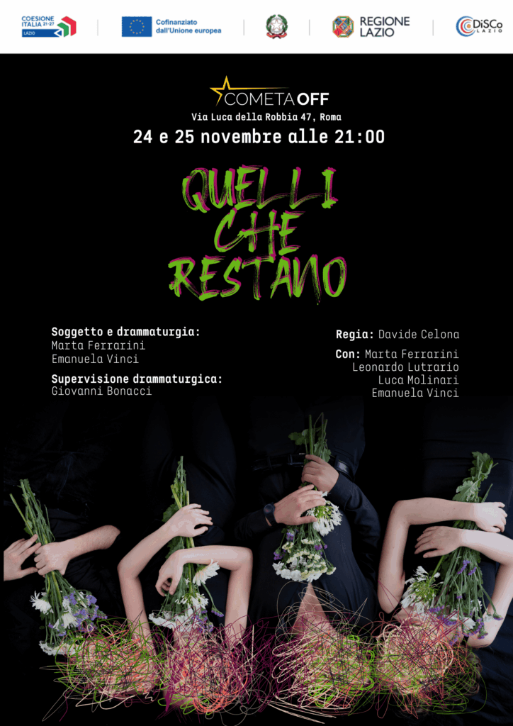 Cosa resta, quando qualcuno se ne va? È da questa domanda che prende corpo QUELLI CHE RESTANO, il nuovo progetto teatrale firmato da Marta Ferrarini ed Emanuela Vinci, uno spettacolo che indaga il lutto, il branco, le famiglie e le assenze. Lo spettacolo, con la regia di Davide Celona, vede in scena Marta Ferrarini, Leonardo Lutrario, Luca Molinari ed Emanuela Vinci. La supervisione drammaturgica è di Giovanni Bonacci. Lo spettacolo sarà in scena al Teatro Cometa il 24 e 25 novembre 2025.