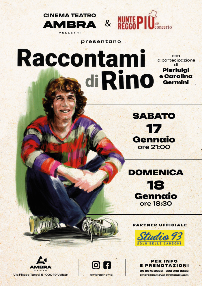Sabato 17 gennaio, alle ore 21, prende vita il Teatro Ambra!  Nuovo, moderno ed accogliente. Parte integrante del Cinema Ambra Multiplex di Velletri, esordisce con l’evento live “Raccontami di Rino”. Non solo un tributo della nota ed apprezzata band “Nunte Reggo Più” ad un grande artista ma il racconto appassionante della vita di Rino Gaetano, narrato da un grande amico del cantautore calabrese, Pierluigi Germini. Due ore di pura emozione con le canzoni immortali del Grande Rino. Una serata inaugurale di una prima stagione teatrale – live che si annuncia ricca di sorprese. Il calendario verrà svelato a breve. Una sala confortevole, uno studio – laboratorio, una salotto culturale dedicato a pre e post eventi dove sarà possibile godersi momenti di convivialità e riflessione, una tecnica all’altezza, un ampio parcheggio.L’assenza di barriere architettoniche fanno del Teatro Ambra un luogo di facile accesso ed ideale per eventi , workshop e masterclass. L’appuntamento zero è per sabato 17 alle ore 21 e domenica 18 gennaio 2026  alle ore 18.30. La testimonianza e la presenza al battesimo di un nuovo Teatro, luogo di emozioni forti e “terapia  collettiva”, è  da non mancare. Le luci si stanno per accendere, il palco sta per animarsi, i musicisti stanno per iniziare. Rino Gaetano sta per tornare… mettetevi comodi e godetevi lo spettacolo. Buon Teatro a tutti!