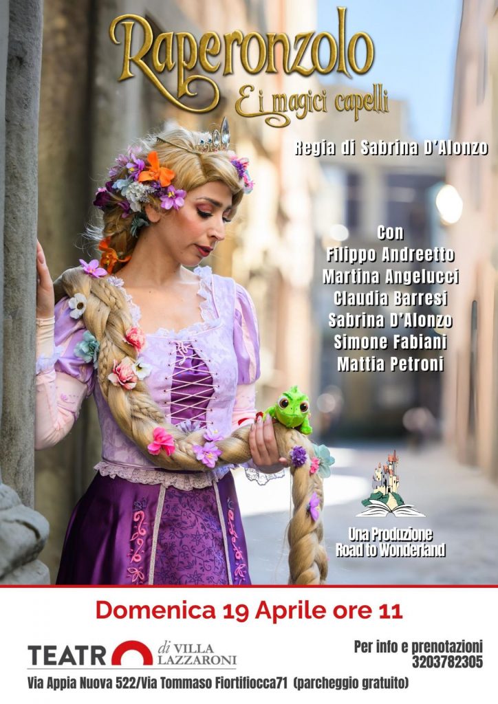 Domenica 19 aprile la Compagnia Road to Wonderland torna sul palco del Teatro di Villa Lazzaroni con un nuovo spettacolo per tutta la famiglia: RAPERONZOLO e i magici capelli, regia di Sabrina D’Alonzo, con Filippo Andreetto, Martina Angelucci, Claudia Barresi, Sabrina D’Alonzo, Simone Fabiani, Mattia Petroni.