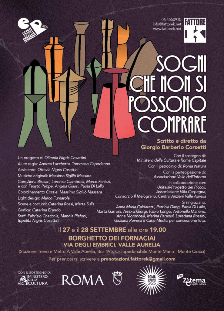 Un borgo storico nel cuore di Valle Aurelia – dimora delle fornaci romane per i laterizi e dei suoi fornaciai – si trasforma in palcoscenico, un parco urbano diventa scenario di poesia e visioni e proprio qui prende vita “Sogni che non si possono comprare”. Il nuovo progetto teatrale scritto e diretto da Giorgio Barberio Corsetti, con le musiche originali di Massimo Sigillò Massara, in scena il 27 e 28 settembre al Borghetto dei Fornaciari.