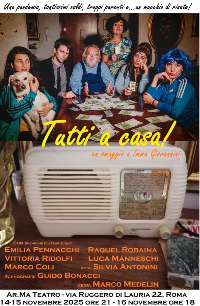 In “Tutti a casa!”, una famiglia si ritrova chiusa tra quattro mura durante la pandemia: tra paure, convivenze forzate e segreti pronti a esplodere, i giorni scorrono fino all’arrivo di una zia un po’ invadente che, oltre al virus, porta con sé una valigia misteriosa… forse piena di soldi, forse piena di guai.