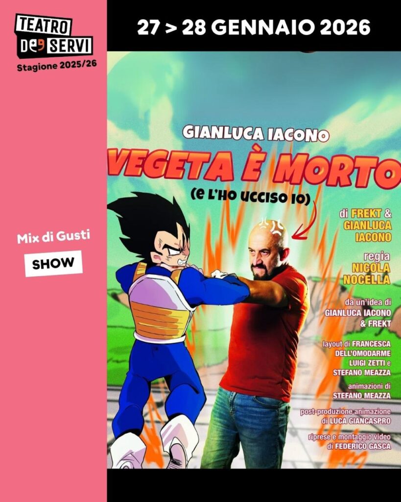 Appuntamento speciale al Teatro de’ Servi il 27 e il 28 gennaio con Gianluca Iacono e il suo VEGETA È MORTO E L’HO UCCISO IO, con la regia di Nicola Nocella.