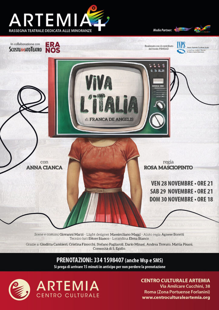 A chiudere la rassegna sarà VIVA L’ITALIA, testo di Franca De Angelis diretto da Rosa Masciopinto, un monologo vibrante e poetico che, attraverso lo sguardo puro e disarmante della sua protagonista, racconta la solitudine, il coraggio e la necessità di scegliere la propria libertà.