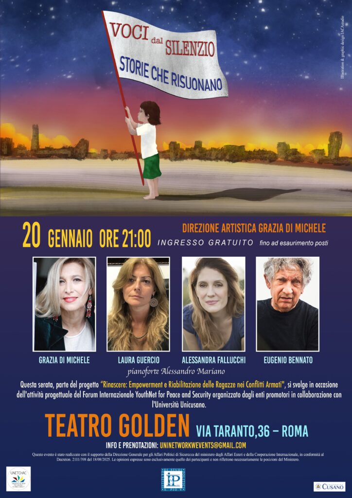 Il 20 gennaio 2026 ore 21, con ingresso gratuito, il teatro Golden situato a Roma in via Taranto, ospita “Voci nel Silenzio: Storie che Risuonano”, con Grazia di Michele, che segue anche la direzione artistica, Laura Guercio, Alessandra Fallucchi, Eugenio Bennato. La performance si compone di una parte narrativa, accompagnata dal pianoforte della Blind Orchestra, in cui le testimonianze delle ragazze vengono restituite in forma scenica, creando un dialogo profondo tra voce e musica, ed una parte performativa, nella quale gli artisti si esibiranno con brani ispirati ai temi della resilienza, della rinascita e della giustizia.