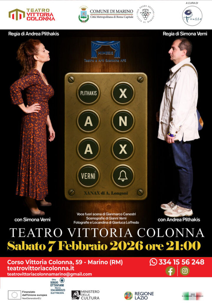 Sabato 7 febbraio 2026 alle ore 21,00 andrà in scena al Teatro V. Colonna di Marino lo spettacolo “Xanax” di Andrea Longoni. Sul palco gli attori Andrea Plithakis e Simona Verni, che hanno curato anche la regia. Voce fuori campo Gianmarco Canestri, Scenografie di Gianni Verni, Fotografia e Locandina di Gianluca Loffredo.