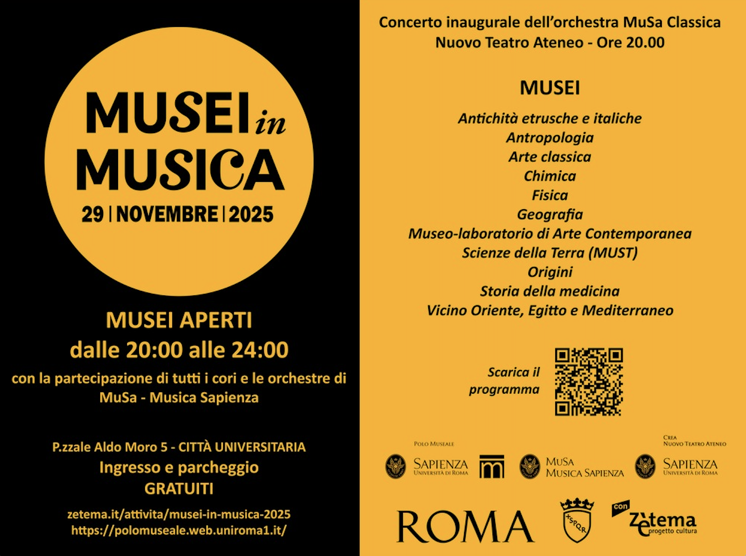 Il Polo Museale Sapienza (PMS) annuncia la partecipazione all’edizione 2025 di Musei in Musica, in programma sabato 29 novembre 2025 dalle ore 20.00 alle