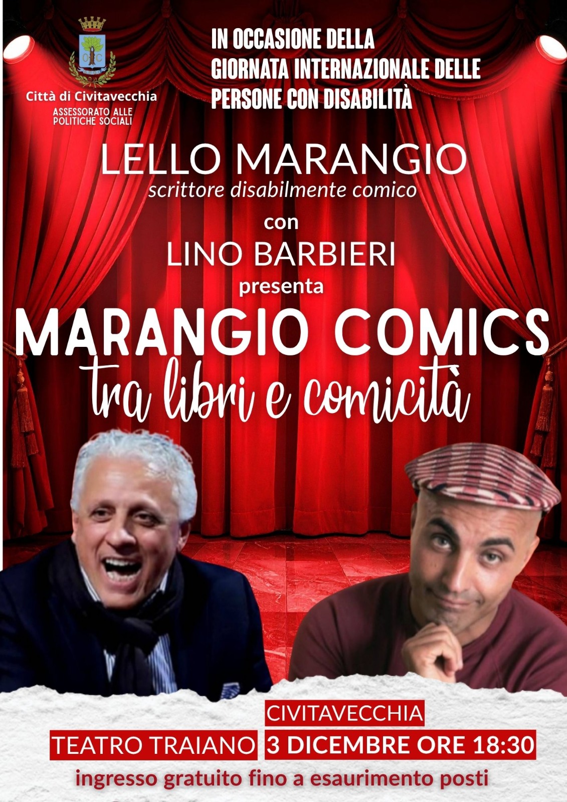MARANGIO COMICS è uno spettacolo disabilmente comico scritto da Lello Marangio e Lino Barbieri che andrà in scena il 3 dicembre presso il Teatro Traiano di