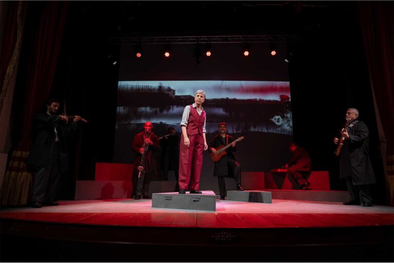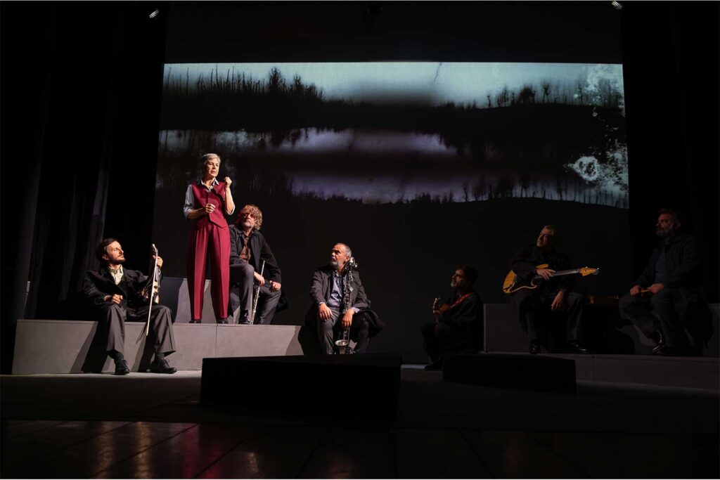 La protagonista, in un monologo di quasi un’ora e mezza, non rimane mai completamente sola sulla scena: a scortare attivamente la narrazione, il complesso musicale de I Solisti dell’Orchestra Multietnica di Arezzo composto da vari elementi musicali. Il gruppo musicale irradia una tensione emotiva da vero coprotagonista coinvolto nella storia, entrando e uscendo dal palco in un accompagnamento musicale persistente anche da dietro le quinte, emancipandosi dalla classica postura da compagine musicale che si è soliti vedere.