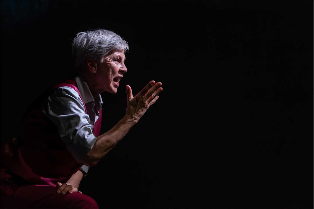 La scenografia e le luci fanno da collante per tutta la rappresentazione come a voler sostenere l’attrice e tutto il racconto fino alla fine in un percorso sensoriale unico e travolgente. Sulla scena blocchi grigi di varie forme geometriche vengono ripetutamente spostati nei vari cambi di scena scanditi dalle tematiche suggerite nello sfondo proiettato sulla scena con parole scritte a caratteri cubitali e con immagini che precedono iconograficamente luoghi ed argomenti.