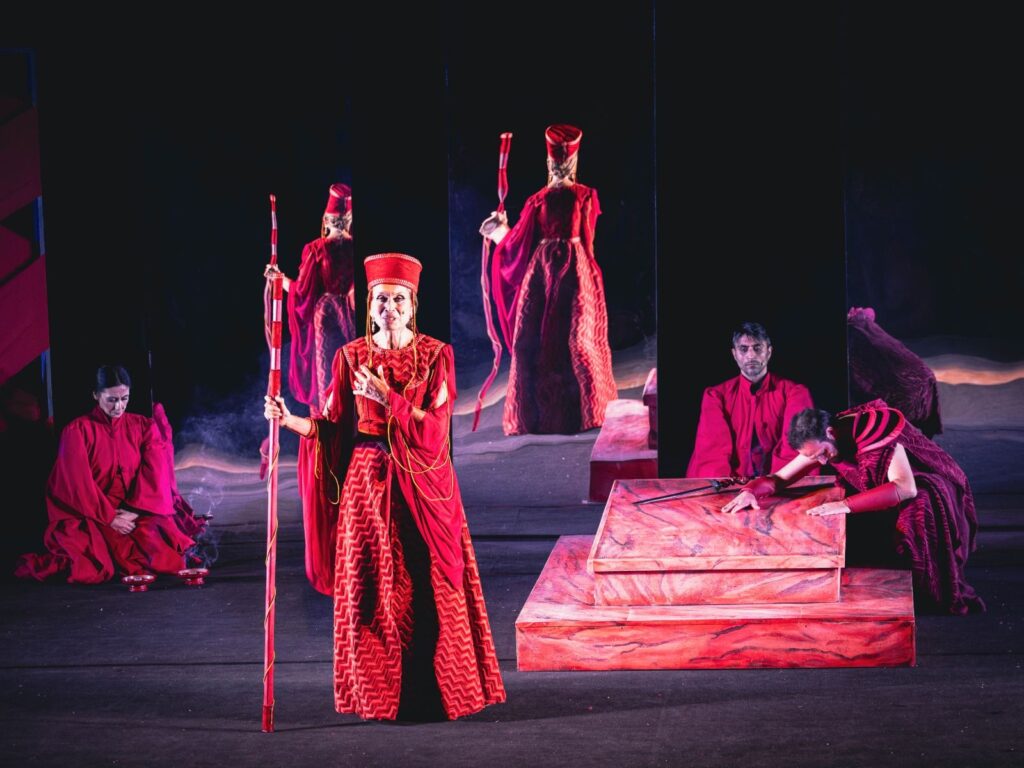 La regia di Nicasio Anzelmo cavalca questa “oscillazione tra responsabilità divine e umane” con eleganza. L’impatto visivo e sonoro è fondamentale: le scene e i costumi di Vincenzo La Mendola incorniciano una vicenda dove l’impossibilità di distinguere tra apparenza e realtà diventa il leitmotiv. Il coro non è un accessorio, ma un elemento vivo che si esibisce in danze da dervisci su musiche originali di Giovanni Zappalorto e movimenti coreografici di Barbara Cacciato.