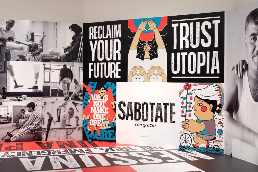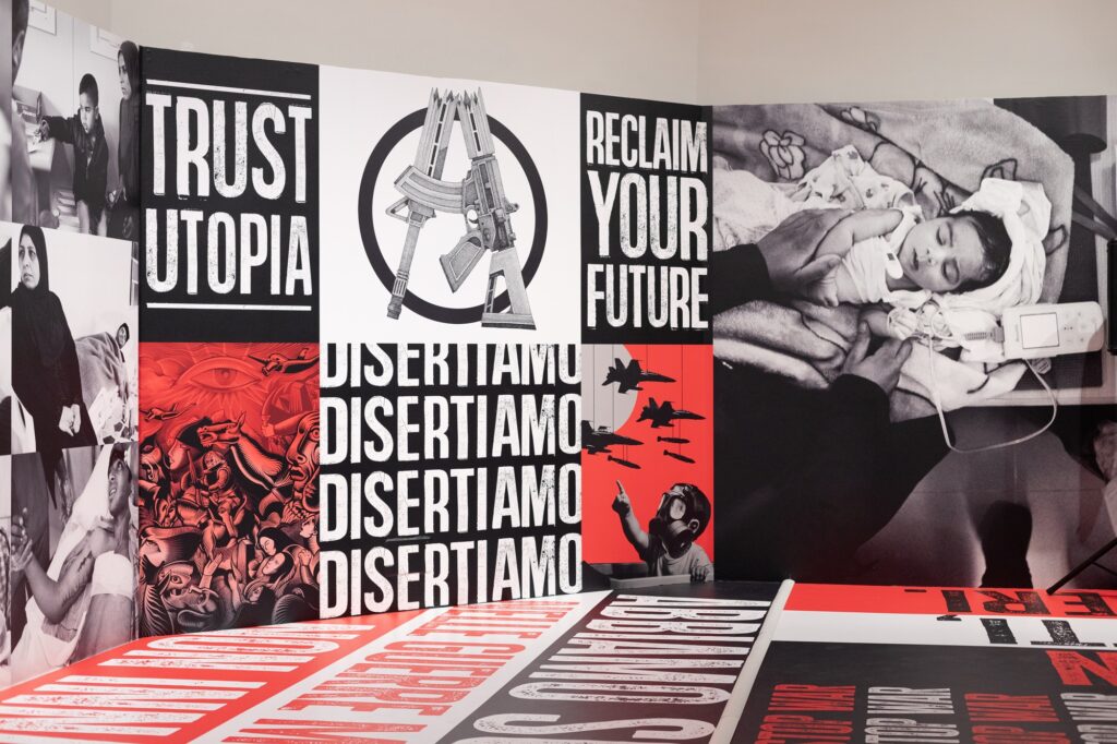 La mostra Contro la guerra – sguardi e immaginari, aperta gratuitamente fino al 26 ottobre 2025 presso il Palazzo dei Musei di Reggio Emilia, si inserisce all’interno del Festival Emergency 2025 ed è, di fatto, un percorso (già proposto quest’anno presso il Palazzo delle Esposizioni di Roma), che raccoglie luoghi, voci e contesti di guerra e sofferenze, ma è anche la manifestazione e la testimonianza di forza e di impegno tramite foto e immagini. Numerose installazioni, poster, slogan (“Trust Utopia”), scritte a caratteri giganti avvolgono lo spazio per “far parlare” i luoghi e le persone. Sono riportati gli orrori della guerra, macerie, distruzioni ma anche coloro che, con coraggio e determinazione, portano avanti un messaggio di pace, di speranza, di protesta, di aiuto umanitario.