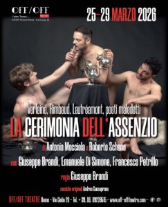 “La cerimonia dell’assenzio”, testo di Antonio Mocciola e Roberto Schena, con la regia di Giuseppe Brandi che dirige Emanuele Di Simone e Francesco Petrillo accanto a cui recita anche