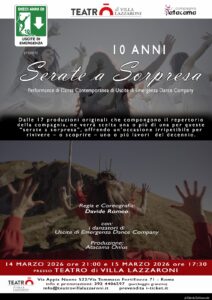 Sabato 14 e domenica 15 marzo la Compagnia Uscite d’Emergenza presenta 10 ANNI. UNA SERATA A SORPRESA, coreografie e regia di Davide Romeo.