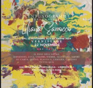 Galleria della Tartaruga – libreria Eli. Dal 22 novembre al 5 dicembre 2024 a VENTUNOGRAMMI Personale di Liliana Sarrocco Il