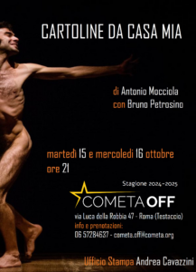 Teatro Cometa Off martedì 15 e mercoledì 16 ottobre 2024 – ore 21:00 CARTOLINE DA CASA MIA di Antonio Mocciola con Bruno
