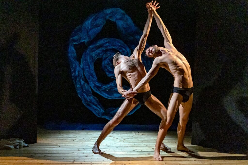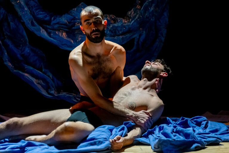All’apertura dello spettacolo, il pubblico accede in sala avvolto dal suono dell’acqua. Sul fondo del palco, un’onda stilizzata si avviluppa su sé stessa, costante e quasi ipnotica, introducendo a un mondo in cui il mare diventa memoria, desiderio, ferita. Su questo palcoscenico essenziale, si muovono Diego e Mirko: due corpi, due solitudini che si cercano e si temono. Diego osserva, trattiene, analizza; Mirko si lascia travolgere, gioca con il rischio. L’acqua – evocata più che rappresentata – diventa materia simbolica del loro incontro: un luogo dove ci si affonda, ci si riemerge e si tenta di imparare a respirare.