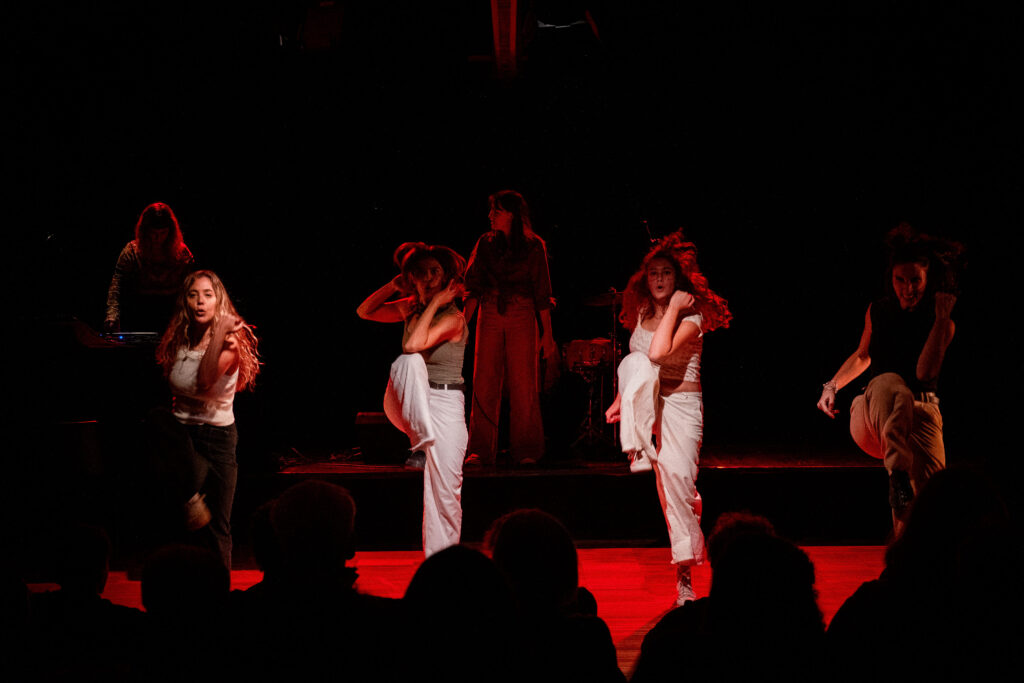 Prima una, poi l’altra, le cinque in scena divengono coro, un coro che parla, canta e danza tra linguaggio comico, poi drammatico, poi irriverente. Ed ecco che tra un inizio fatto di apparente leggerezza si fa avanti un autentico rito primordiale, qui iniziato con il sangue, filo conduttore iniziale tra le ragazze. Prima ferita, poi mestruazione, poi sesso e rottura dell’imene, tutte fasi che il corpo di una donna attraversa e che diventano simboliche.