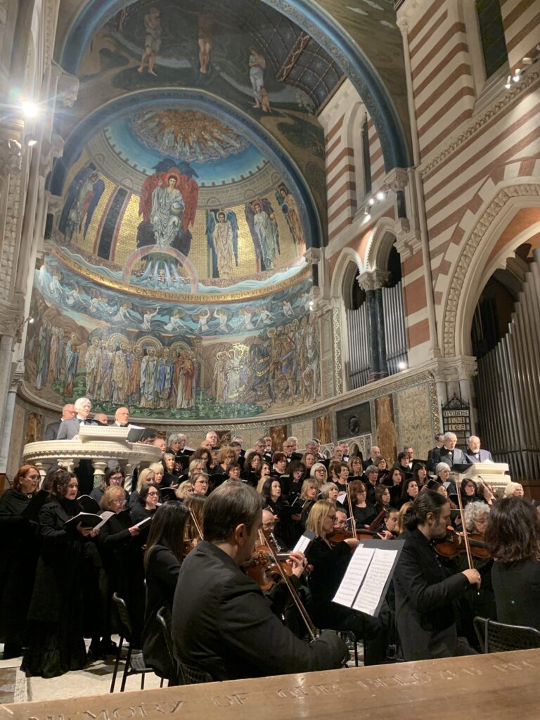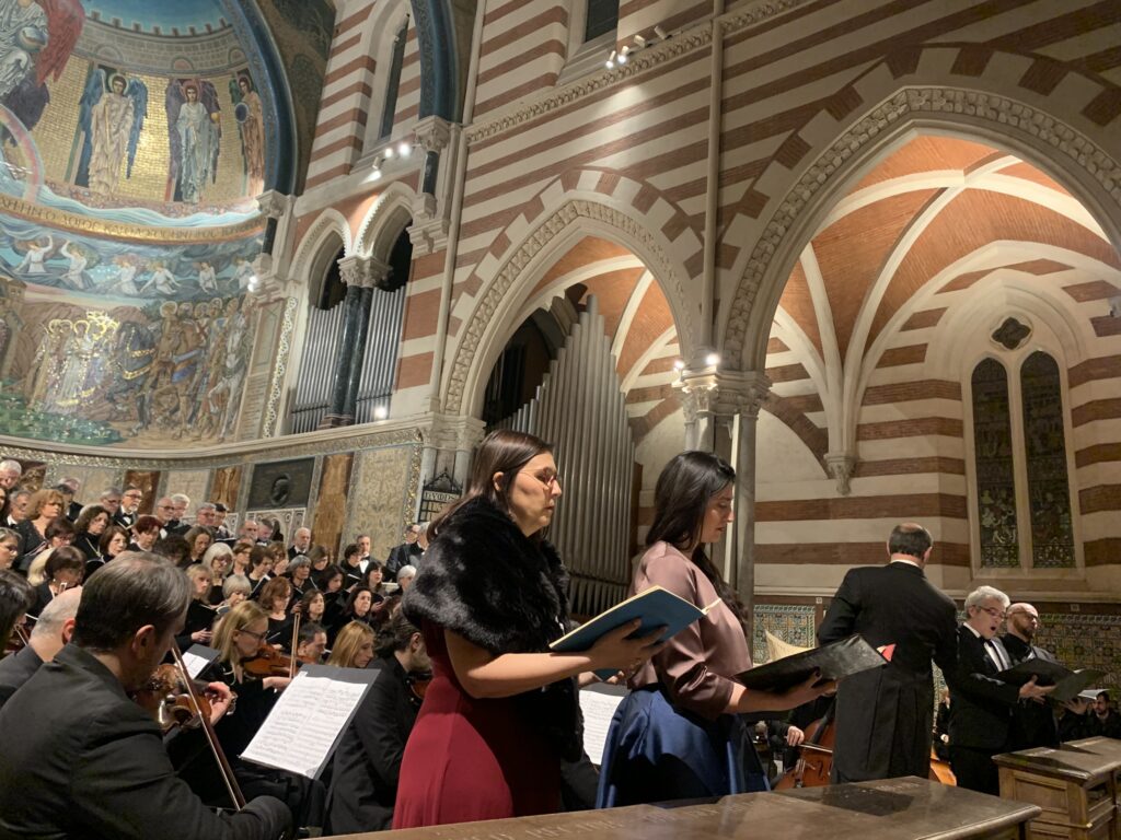 L’interpretazione del Requiem in Re minore di Mozart ribalta completamente l’atmosfera giocosa del Concerto di Koželuch. I due cori, affiancati dall’orchestra e dai quattro solisti, hanno delineato una lettura in cui la forza emotiva dell’opera si è imposta con evidenza anche sul piano visivo: era impossibile non notare, infatti, una sorta di corrispondenza tra l’ampio corpo corale che traboccava dall’altare, e la raffigurazione angelica posta in cima all’abside, dietro di essi. L’esecuzione non è stata perfetta: in alcuni momenti la disparità di elementi tra il coro e l’orchestra ha comportato una prevaricazione sonora della componente vocale rispetto a quella orchestrale, e in qualche passaggio la coordinazione tra le due parti non è stata impeccabile. Eppure, nel complesso, l’opera è stata ben restituita, trovando l’apice dell’esecuzione nel celebre Lacrimosa, costituendo un momento emotivamente potente.